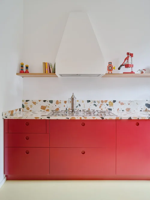Η κουζίνα δηλώνει δυναμικά την παρουσία της με κόκκινες επιφάνειες και πάγκο από μαρμάρο με έντονα νερά, ενώ το κίτρινο δάπεδο από ρητίνη ενισχύει την αίσθηση ζωντάνιας. Στο μπάνιο, η μπλε ρητίνη στο δάπεδο συνδυάζεται με σοβατεπί από πλακίδια terrazzo 20×20 εκ., δημιουργώντας μια ισορροπία ανάμεσα στο σύγχρονο και το διαχρονικό.