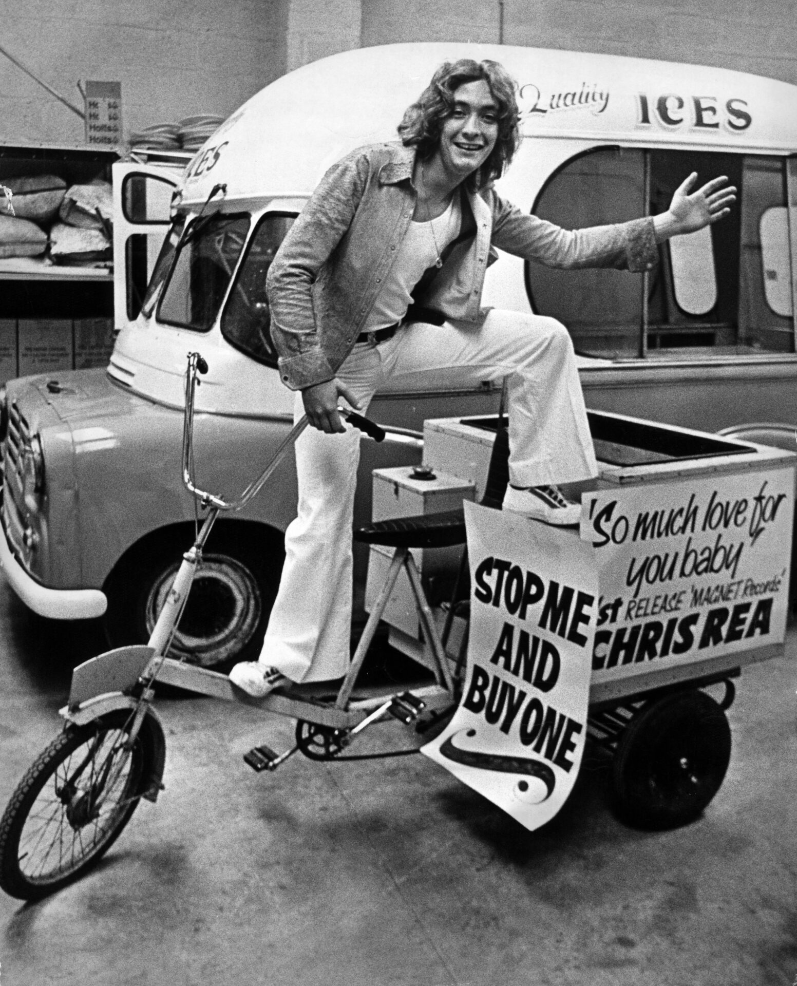 Ο Chris Rea, 22 ετών, προωθεί το νέο του single, So Much Love, το οποίο έγραψε ενώ εργαζόταν για την εταιρεία παγωτού του πατέρα του, στις 24 Ιουνίου 1974. (Φωτογραφία από Teesside Archive/Mirrorpix/Getty Images)