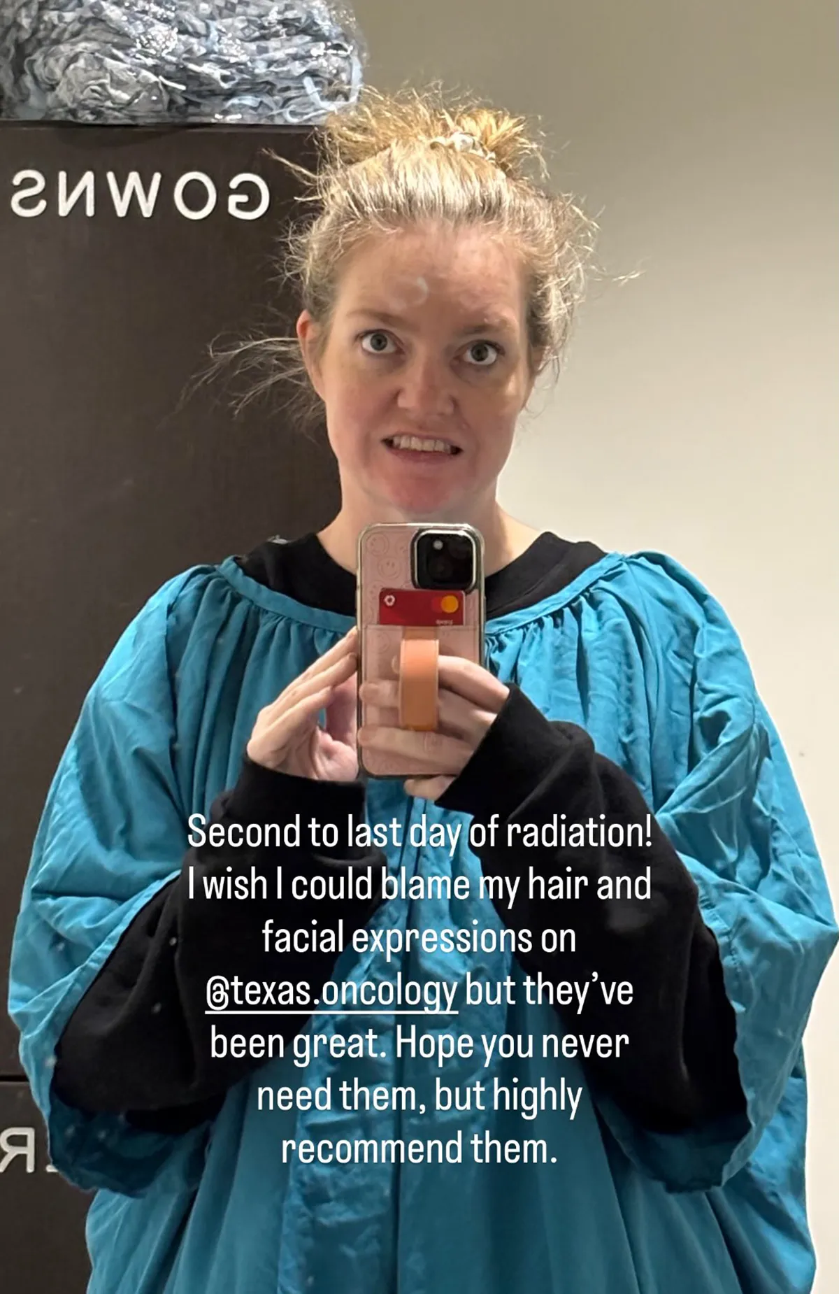 «Η προτελευταία μέρα ακτινοβολίας. Θα ήθελα να ρίξω την ευθύνη για τα μαλλιά και τις εκφράσεις μου στο @Texas.Oncology, αλλά ήταν εξαιρετικοί. Ελπίζω να μην χρειαστείτε ποτέ τις υπηρεσίες τους, αλλά τους συστήνω ανεπιφύλακτα.»