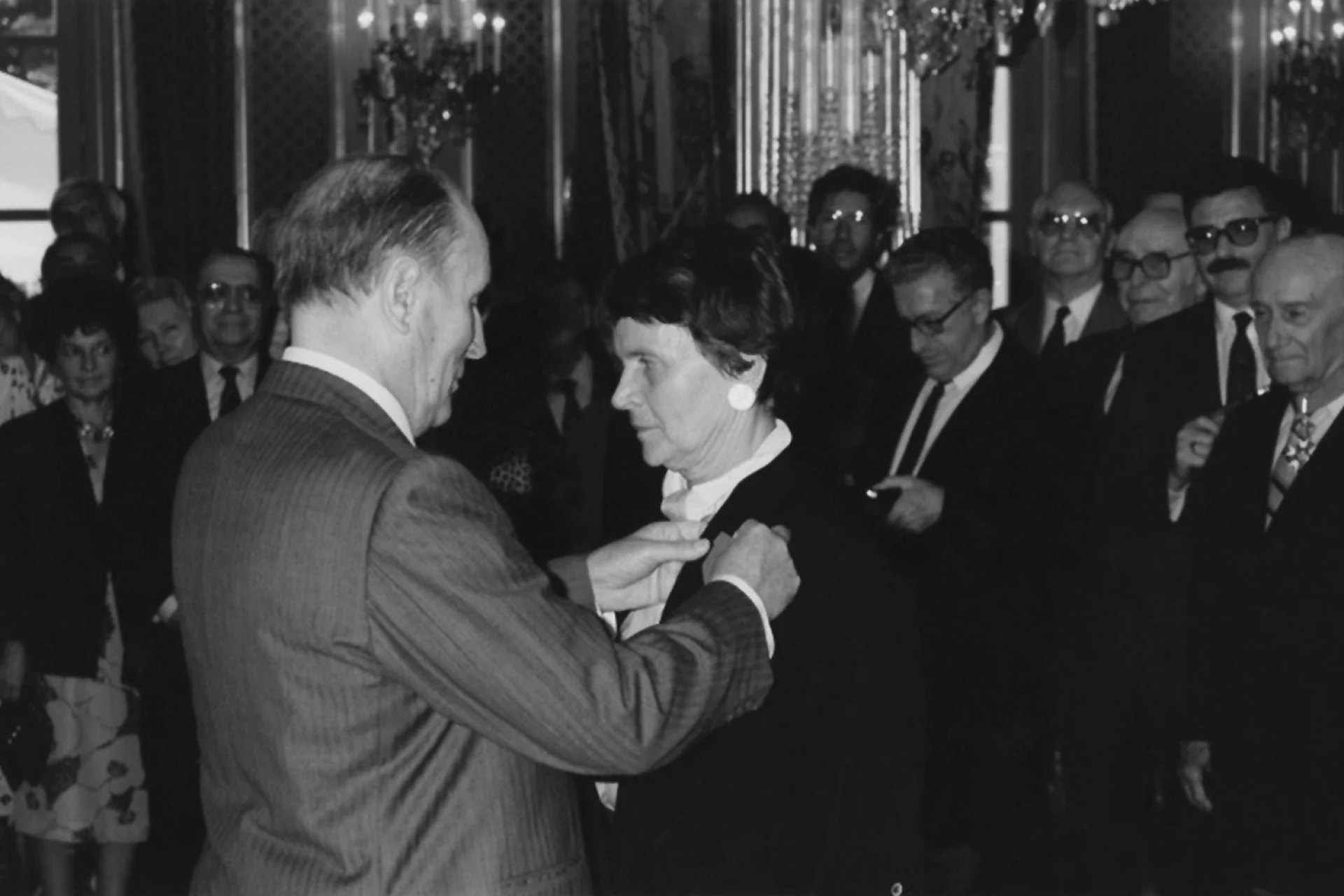 Ο Πρόεδρος François Mitterrand, απονέμει στην Ελένη Γλύκατζη Αρβελέρ τον Χρυσό Σταυρό της Λεγεώνος της Τιμής © Ελένη Γλύκατζη-Αρβελέρ, «600 μολύβια και 10 ποιήματα», Eκδόσεις: Γκοβόστη